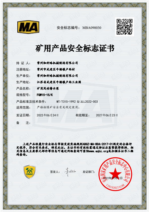 • 礦用安全標(biāo)志證書(shū)-FQW15-15/K